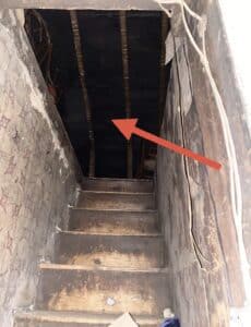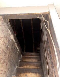 - This photograph was taken looking up from the Bar Room to the top of the Attic steps. This occurred right after we heard two whispers in different locations of the room. We added a photograph below that which was taken just seconds before for a comparison.