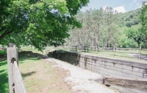 Still standing to this day is Gaston’s Mill. This mill powered and produced the income for the small town of Sprucevale. Gretchen’s Lock also stands, at least a portion of it with its’ huge swinging gate and stone structure. Unfortunately, the surrounding buildings all fell into disrepair and all that remained were stone foundation. Luckily, the state stepped in and re-built the old, historical buildings over top of the original locations. Currently, there is a chapel, a shop, an outhouse (don’t try to use it, they don’t appreciate that), a wooden bridge, and the original bell.