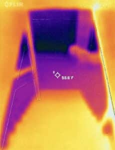 • This thermal image below was captured as we were walking down the staircase. Knowing what we do now, we’re thinking that this may be the dog Bailey who Albert referenced earlier in the night. The regular, non-thermal image is shown next to it.