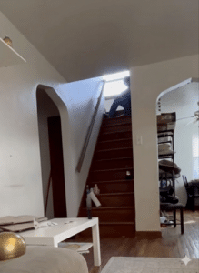 The staircase served as the primary focal point of the investigation and the area where the majority of active communication took place. One investigator was positioned in the upstairs hallway near the top of the stairs, another remained downstairs in the living room, and a third investigator conducted the ESTES Method under sensory deprivation. This configuration allowed for layered observation while minimizing cross-contamination of sound and influence. Prior to the investigation, the homeowner had provided video footage showing a door at the top of the staircase opening and closing on its own, which directly informed device placement in this area.