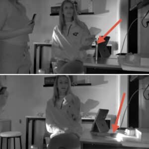 • The flashlight on the back table turned on immediately, at :03, then back off at :04.