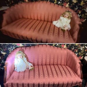 • The images below are of Peggy, the doll in the parlor. At first she was sitting upright on the right side but at the end of the evening she had moved to the left side of the couch seemingly on her own. The image below shows where the doll was placed during our walkthrough on the top portion while the image on the bottom section shows where we found her during our clean up period.