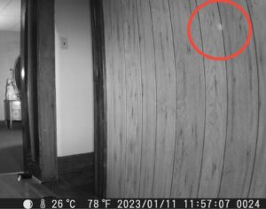 • There were a few light anomalies captured during these time frames which we could not conclude were dust particles or bugs. These also seemed to coincide with some other type of activity, whether it was an investigator feeling as though someone was standing in the hallway or hearing the creak of footsteps coming from out where the camera was placed.