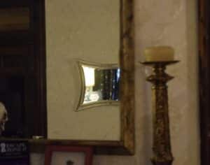 • That same video produced some odd lights but more strikingly something appearing in the mirror. We’re unsure exactly what it is as it flashes at the very end of the video but our documentation here helps pull it out through a still image. The upper image is a full view of the object we noticed. The second image is zoomed in on the anomaly while the third image is a different view of the mirror with nothing in it for comparison.