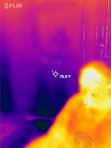 • A thermal image of a colder energy was seen behind the investigator who was situated atop the bed. This imagery can be described as an upper body and head with shoulders and head distinguishable.