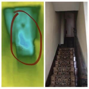 Our FLIR thermal imaging camera managed to capture cold spots in the Carriage House in what appeared to be a pair of legs as well as at the top of the stairs right outside the Ballroom. There was additional cold spots in front of the Attic door again right outside the Ballroom. Even though we didn’t get much activity in Annie’s Room, the thermal camera showed what appeared to be the four legs of a dog standing in the middle of the room during our investigation.