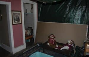 The Doll Room itself had an overall creepy vibe to it during our original walkthrough but didn’t come with much paranormal stories nor activity during our time here. Outside the room is where we slept, but before that we attempted some EVP sessions to no avail. However, as we slept we videotaped ourselves. After analyzing this video, we did capture some phantom footsteps, what sounded like a door opening, crying, some strange whispers, and even a couple moments of knocking noises. These things could not be debunked as we were all asleep and in front of the camera.
