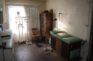 The majority of the Wildwood Sanitarium is still original including many of the interior décor and furniture. This includes items that were found in the basement; leftover by the previous owner of the property. Three years ago, in 2018, the current owner purchased the property on a whim and has been slowly reconstructing it ever since. Throughout its history, much has been lost to the sands of time. The current owners still search for the identity of the original owners of the building and even the year it was built! What is known is that a pair of local doctors, Dr. Perry and Dr. Henderson, purchased the old stone mansion in 1900 and ran a holistic medical clinic beginning in 1906. This facility was ahead of its time and was very successful until the tuberculosis epidemic took such a toll on the area that it forced local authorities to overtake the building to transition it into a tuberculosis infirmary.